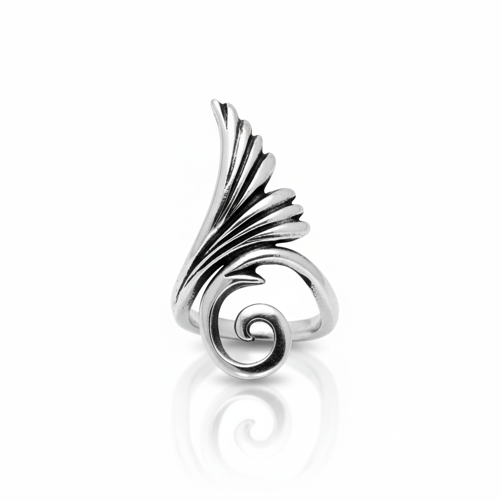 Este anillo de plata de ley 925 es una pieza de joyería de autor que destaca por su dinamismo y estructura fija. El diseño nace de una voluta en espiral en la base, que representa el origen y el impulso, para ascender con fluidez y transformarse en un ala majestuosa ricamente detallada.